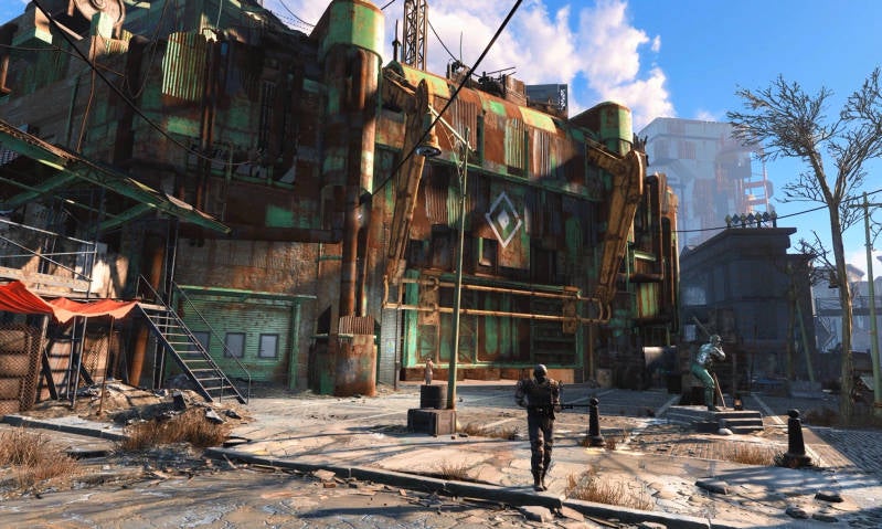 Diamond City  commonly referred to as "The Great Green Jewel," is a fortified settlement in the Commonwealth. This settlement is based on the pre-war structure of Fenway Park, it's distinctive "Green Monster" color visible on the reinforced walls. The city quards can be seen wearing baseball jerseys with umpire's pads and helmets, reflection the location's former use.